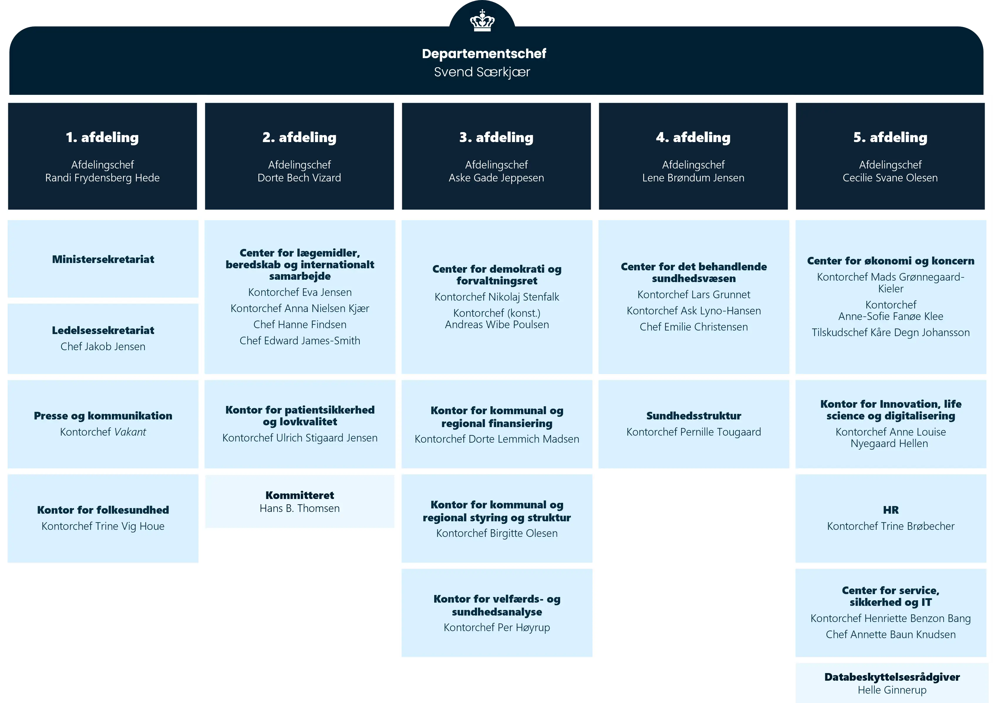 Departementets arbejsområder er inddelt i 5 afdelinger.
